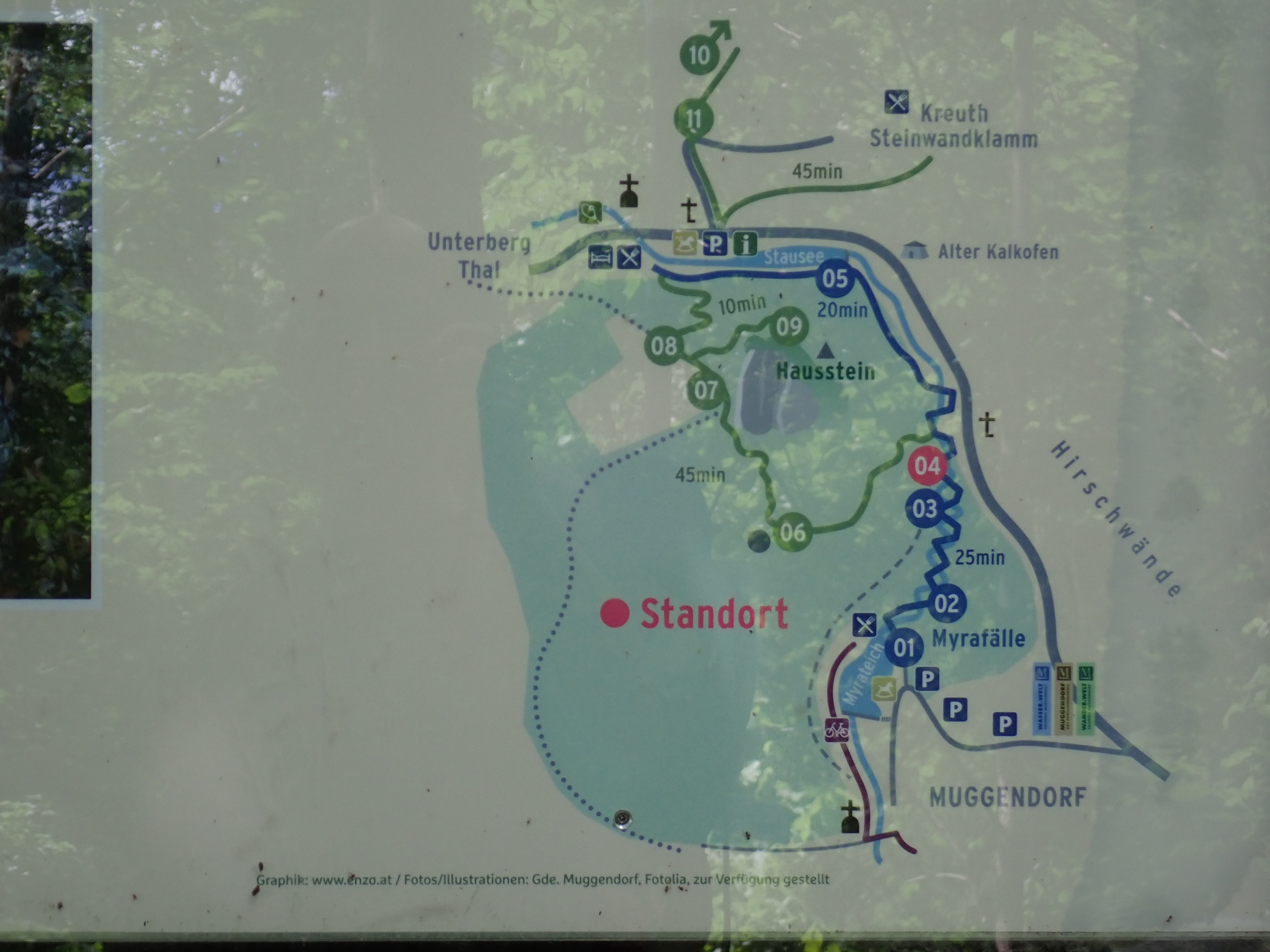 A Myrafälle felső víztározójától eljutva a fogadóig piknikezz egyet, majd új erőre kapva a piros jelzésen tovább eljuthatsz a Hausstein sziklás tetejére. Innen pazar kilátás nyílik a muggendorfi katlanra. Ha ezt a túrát választod, nagyjából 3km a kiindulási ponttól és kb. 2 óra alatt tehető meg. A szintkülönbség viszont a meredek, sziklás csúccsal 170m-re növekszik. A jó bakkancsról se feledkezz meg!