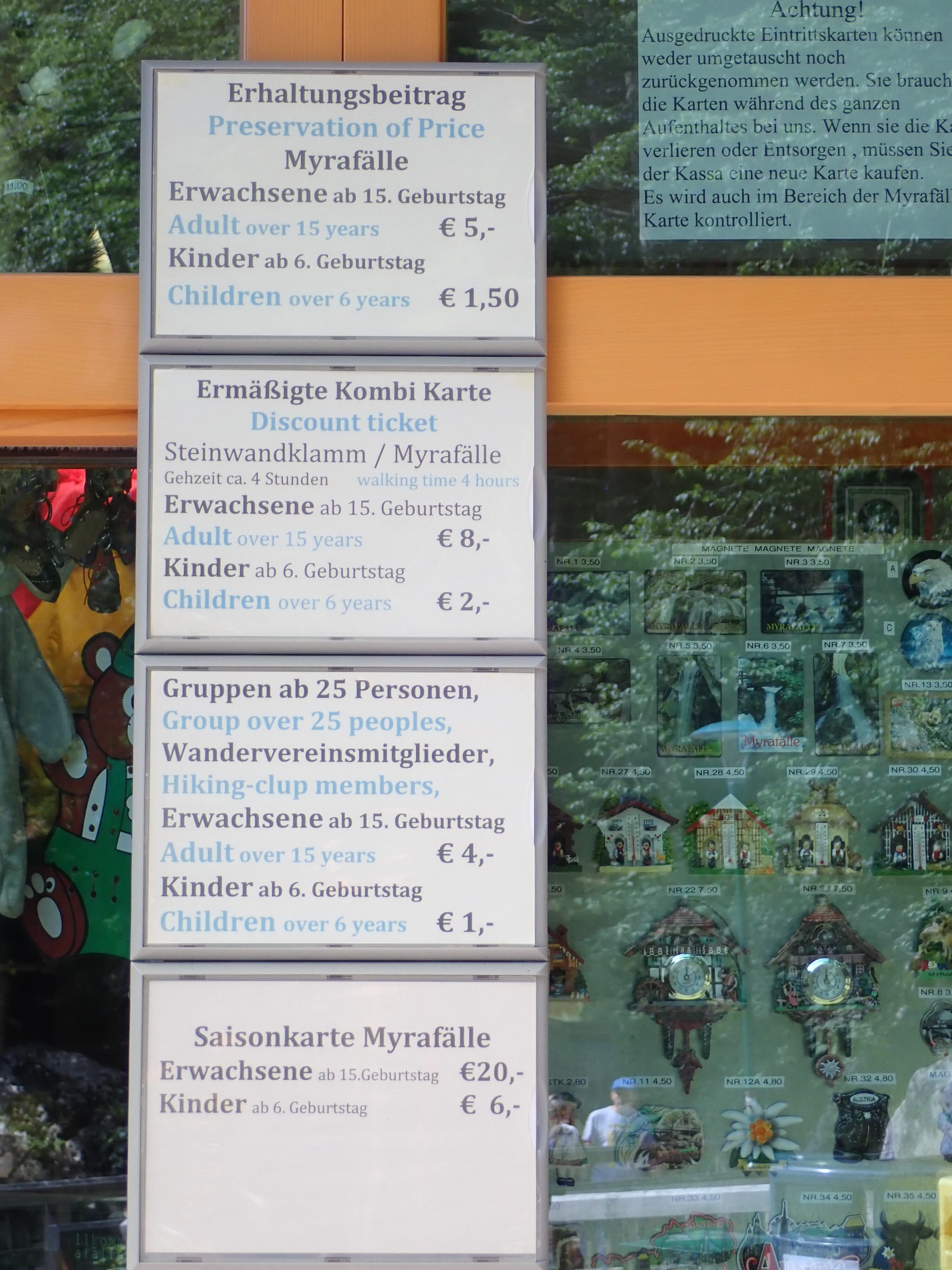 Belépő: Többféle jegy kapható. Csak a Myrafalle vízesés, csak a Steinwand szurdok, vagy kombinált jegy, amivel mindkettő megnézhető. A kombinált út hosszú, azt csak sportos gyerekeseknek ajánlom. De később is eldönthető, mert a Steinwand szurdok bejáratánál is lehet vásárolni.